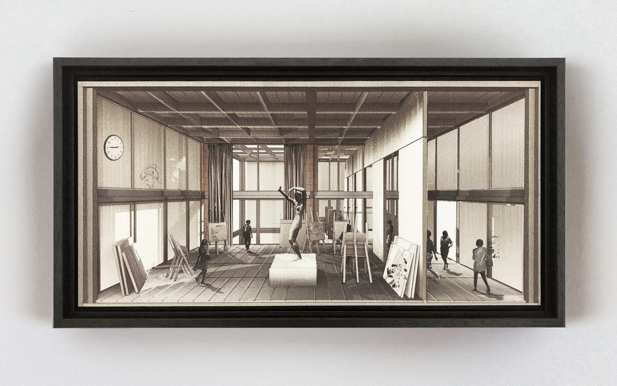 Het schilderij toont het interieur van een atelierruimte in een kunstacademie. Een plek waar de kunststudent ruimte toe-eigent om deze zoveel mogelijk dienstbaar te maken voor het kunstproces. De ruimte is bepaald door indirecte lichtinval en benodigde afmetingen voor kunstobjecten en ezels. Met tekentechnieken wordt gerefereerd aan het kunstproces binnen de hedendaagse kunstacademie, een proces waar is afgewisseld tussen handmatige en machinale tekentechnieken.
