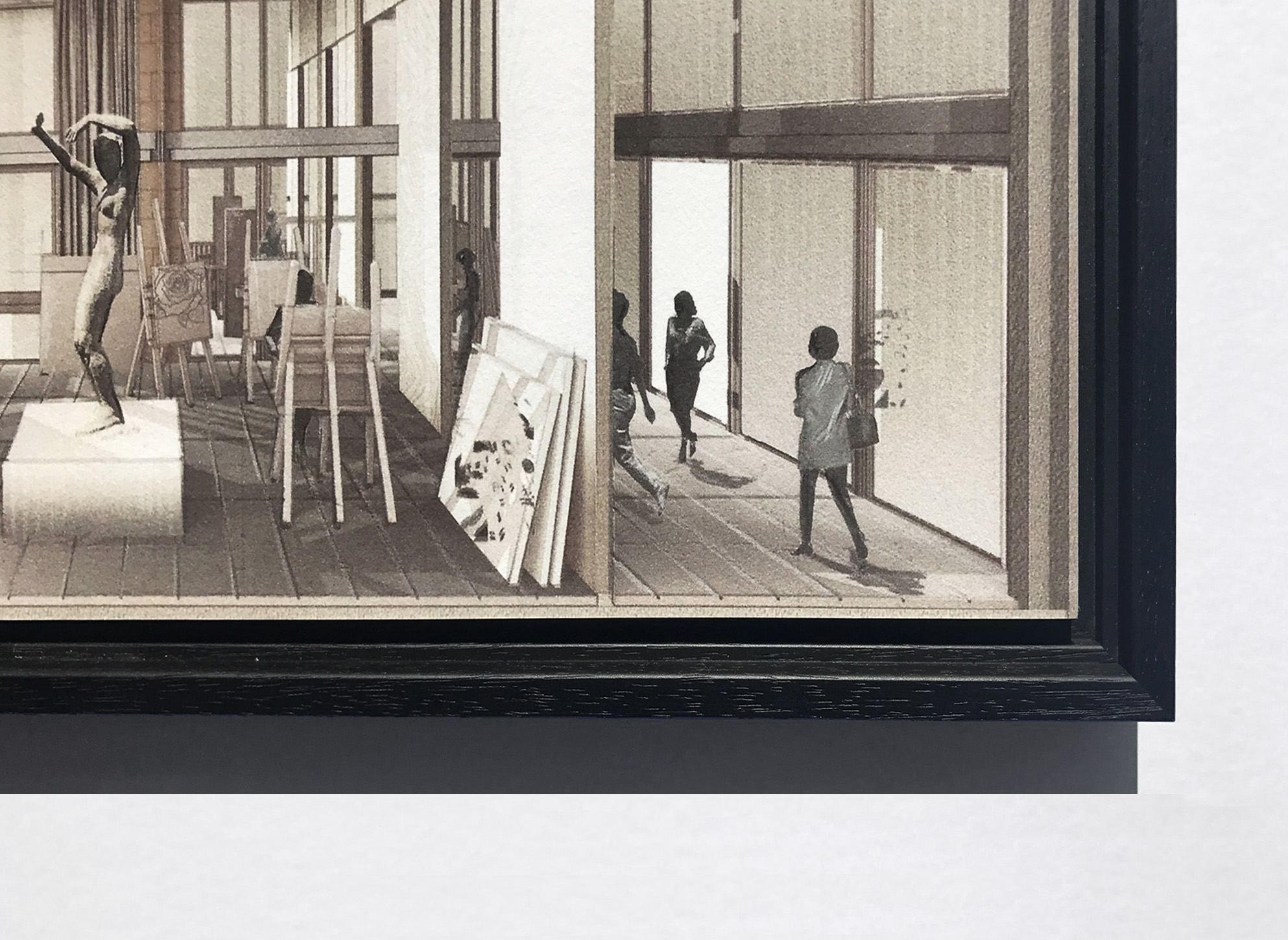 Print op Hahnemühle German Etching ingelijst in zwarte baklijst met trap.