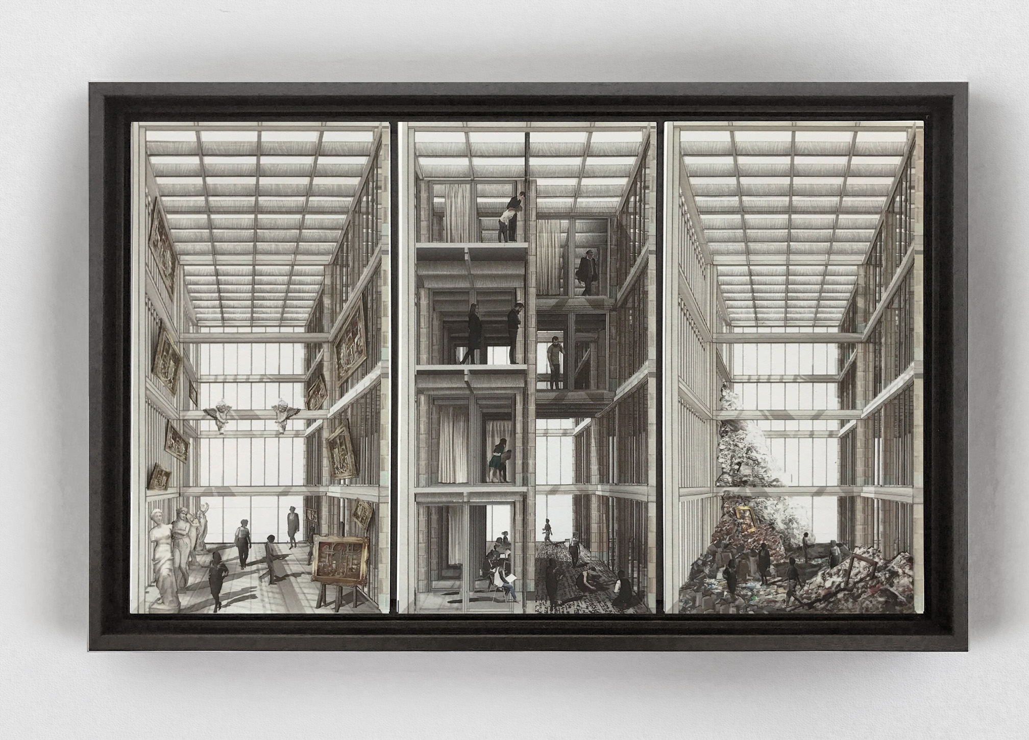 Het schilderij toont de kunstkamer van een kunstacademie. Het drieluik toont scenario’s die ingaan op divers gebruik van eenzelfde kunstkamer. Een gebruik waarbij een expositie plaatsvindt waar met schone kunsten wordt tentoon gesteld, een gebruik waarin met kamers de ruimte opnieuw wordt geproportioneerd en zo kleinere ruimten ontstaan en een gebruik waarin een Arte Povera installatie wordt geëxposeerd. Met tekentechnieken wordt gerefereerd aan het kunstproces binnen de hedendaagse kunstacademie, een proces waar is afgewisseld tussen handmatige en machinale tekentechnieken.