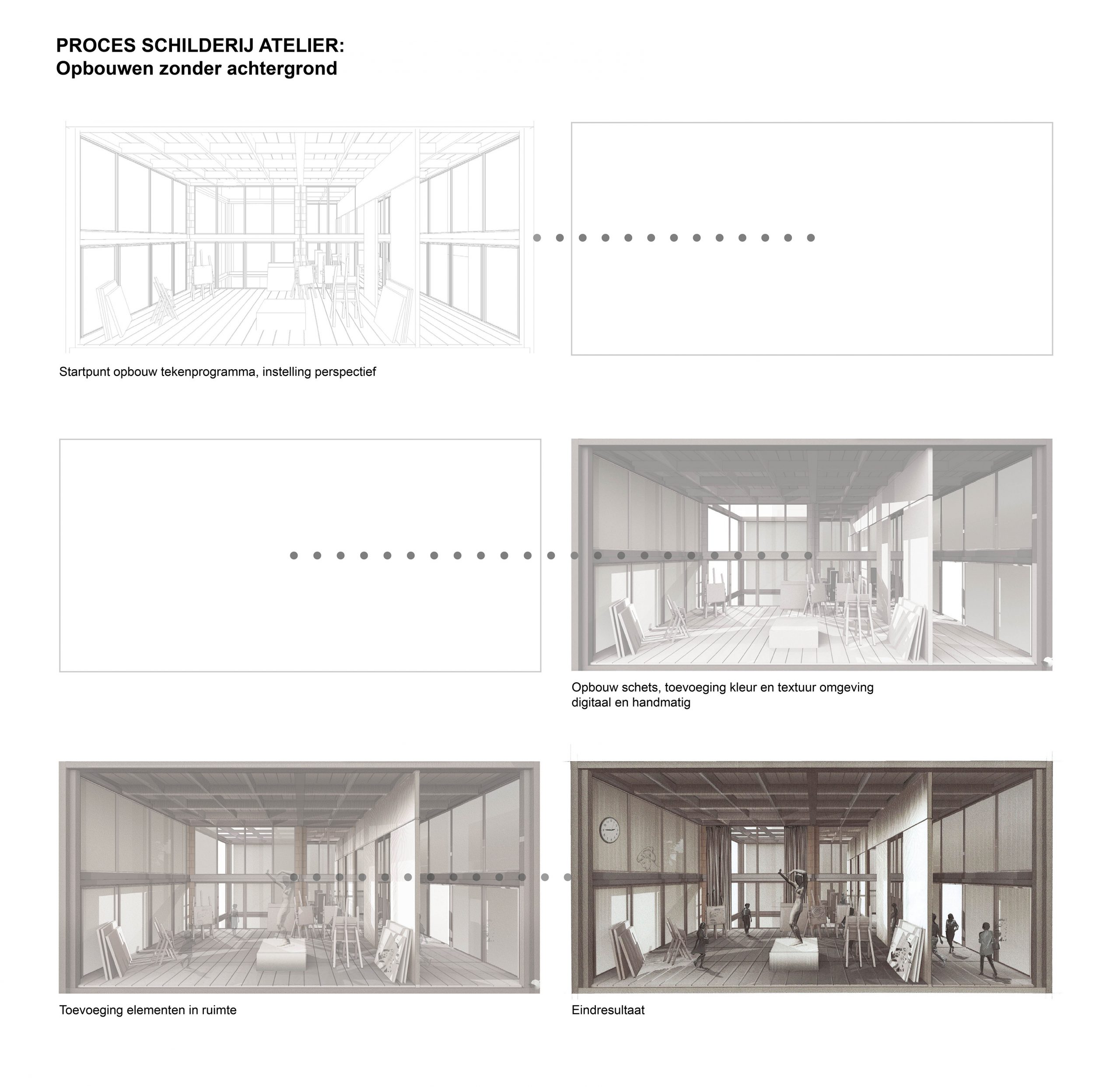 – Het schilderij opbouwen zonder achtergrond, een vrije interpretatie van het beeld zoals schilderijen Façade, Atelier en Kunstkamer.